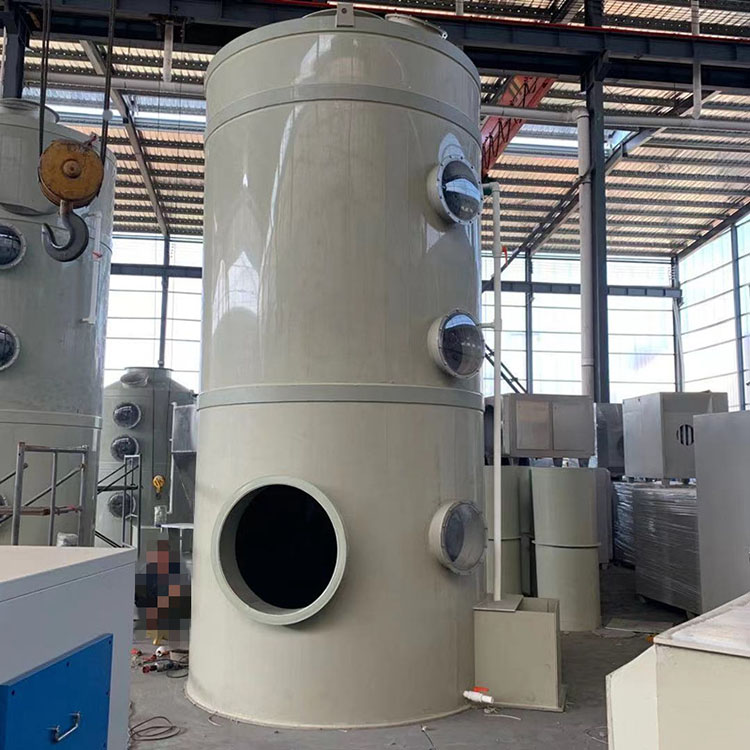 喷淋吸收塔为圆形塔体,具体结构由贮液部分、循环泵、填料层、喷淋段、进风段、布气层、支撑层、脱水填料层(捕沫器)、出风段等组成。操作方便,便于安装检修,强度高,占地面积小。 其中各部分的作用如下: